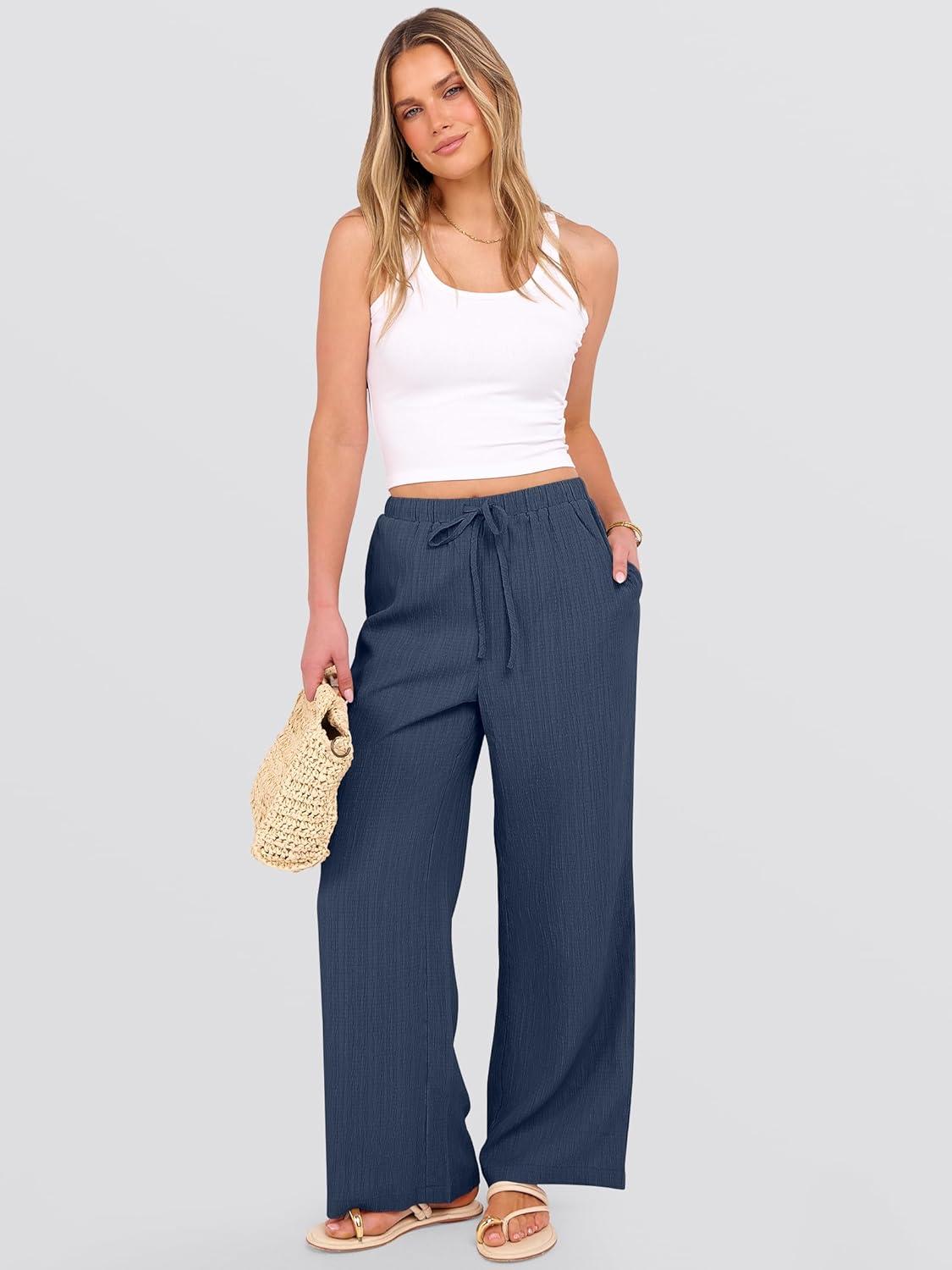 ANRABESS Women’s Wide Leg Beach Pants Elastic Waist Lightweight Casual Flowy Palazzo Lounge Trousers with Pockets(Navy Blue)