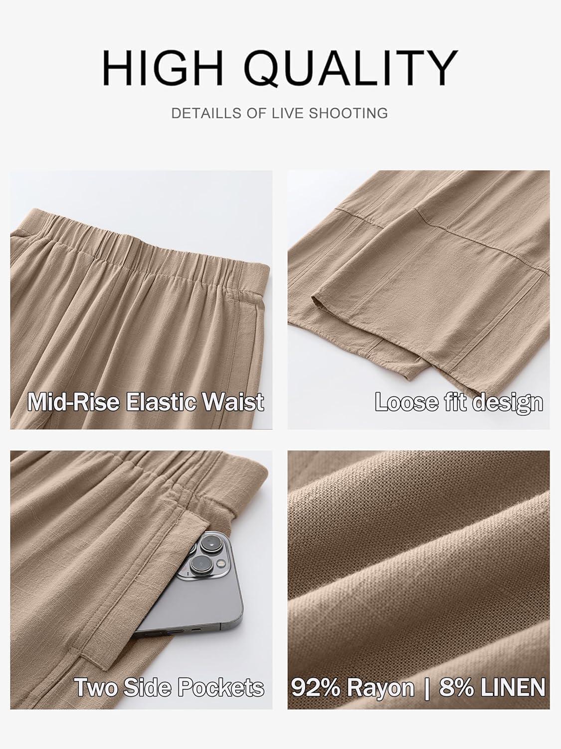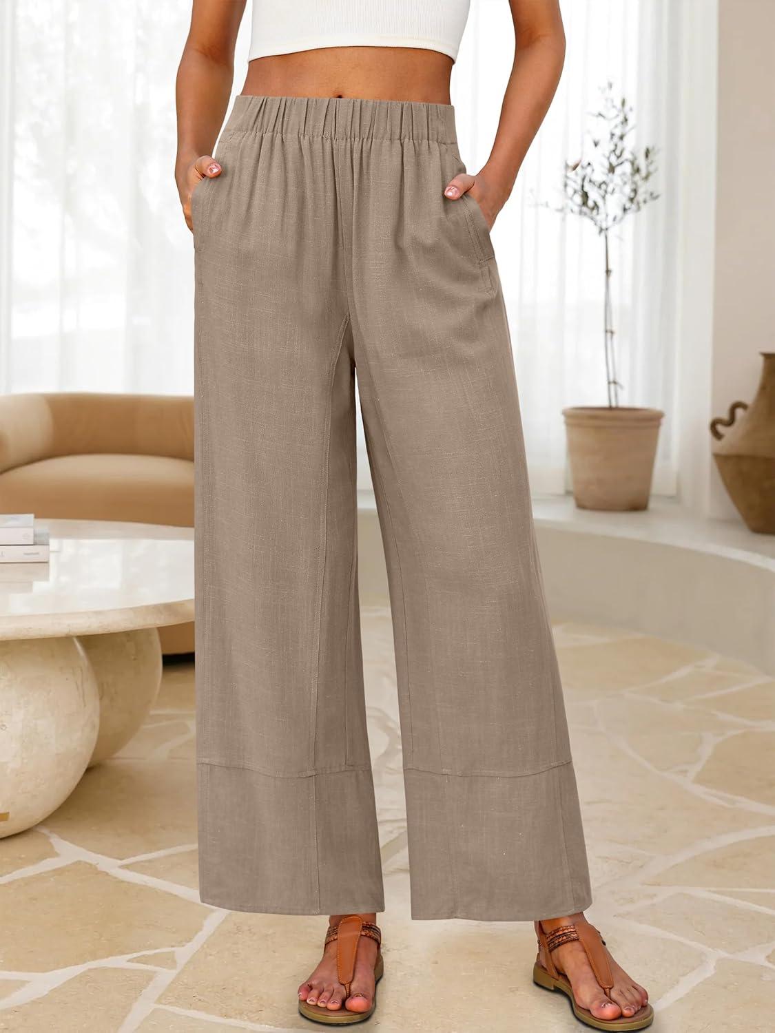 ANRABESS Women’s Wide Leg Linen Pants Summer Boho Casual Elastic Waist Long Lounge Travel Pants Trousers with Pockets(Light Khaki)