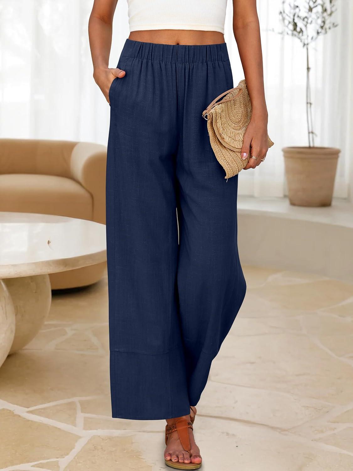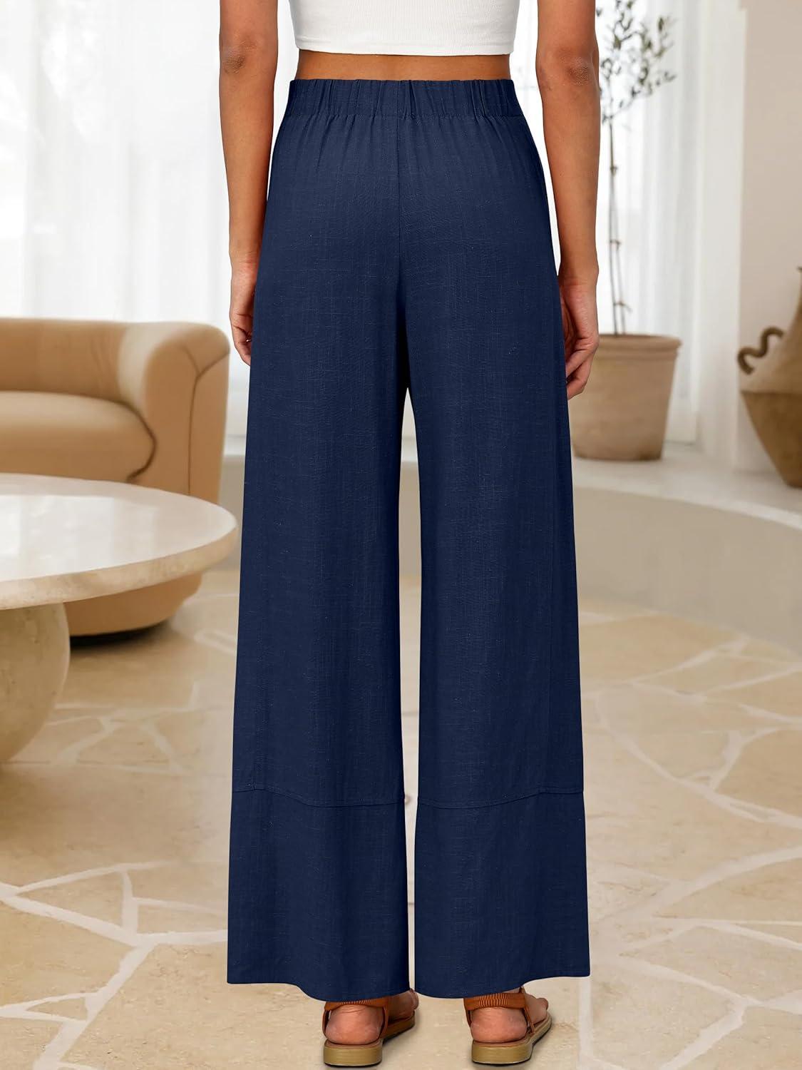 ANRABESS Women's Wide Leg Linen Pants Summer Boho Casual Elastic Waist Long Lounge Travel Pants Trousers with Pockets(Navy Blue)