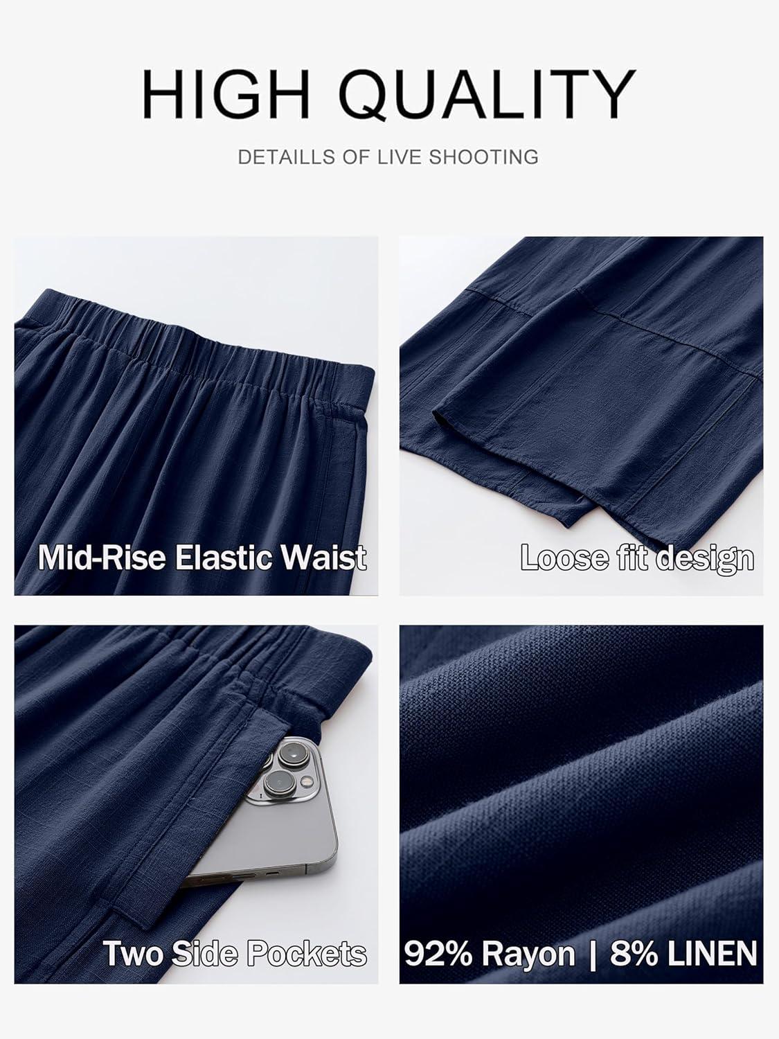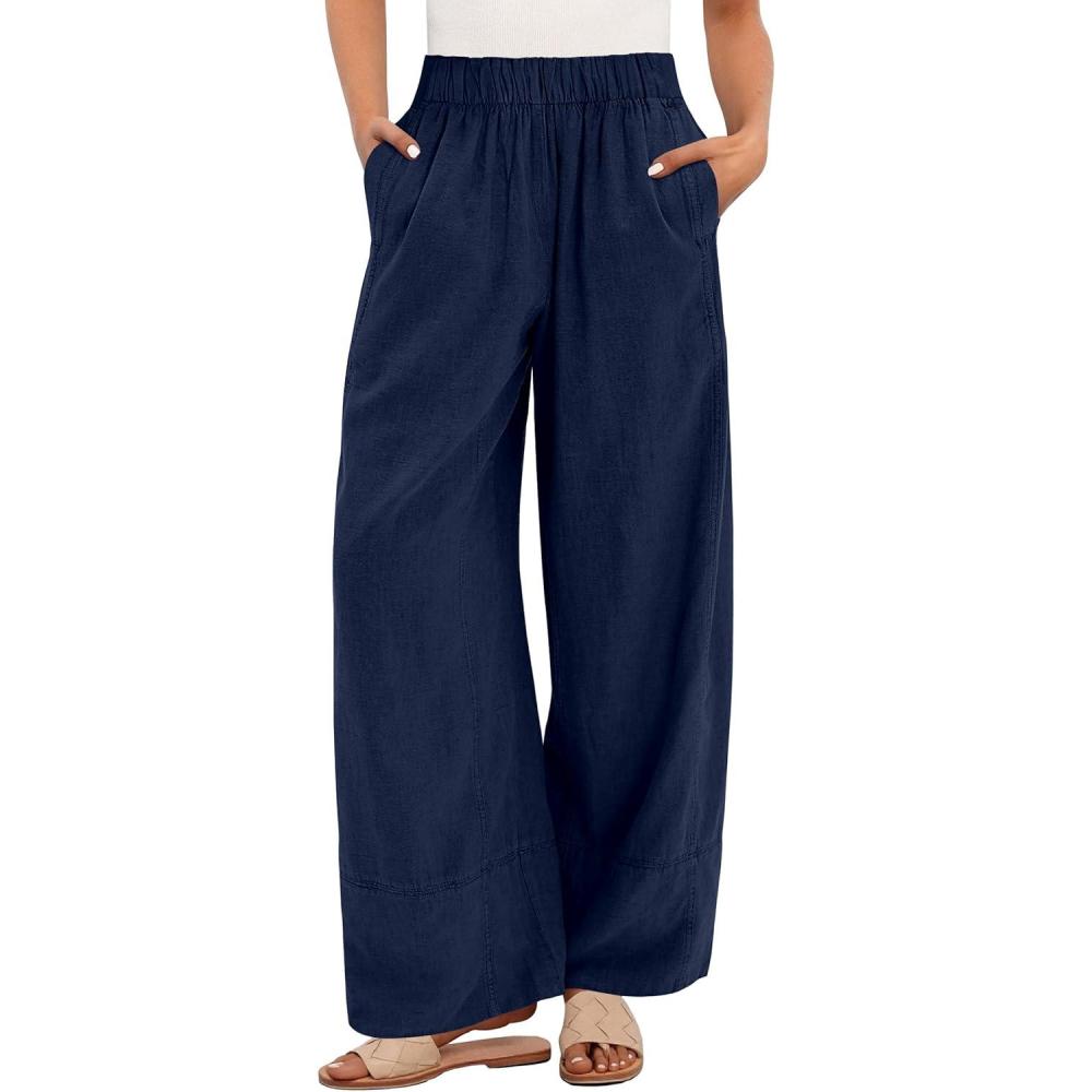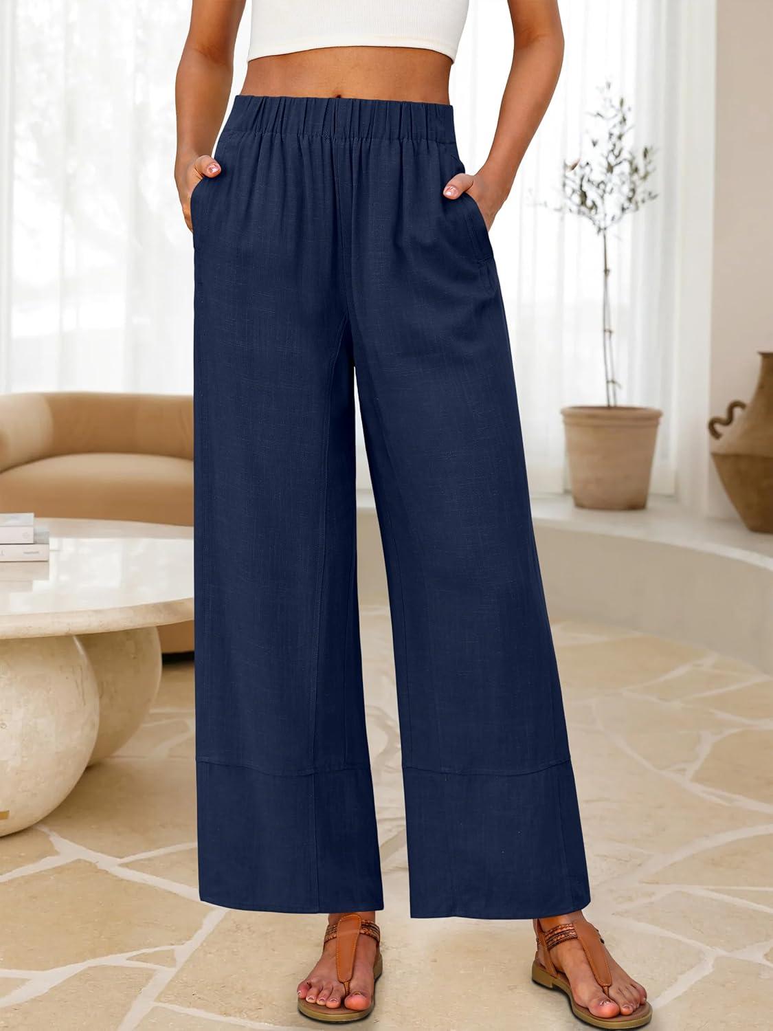 ANRABESS Women’s Wide Leg Linen Pants Summer Boho Casual Elastic Waist Long Lounge Travel Pants Trousers with Pockets(Navy Blue)