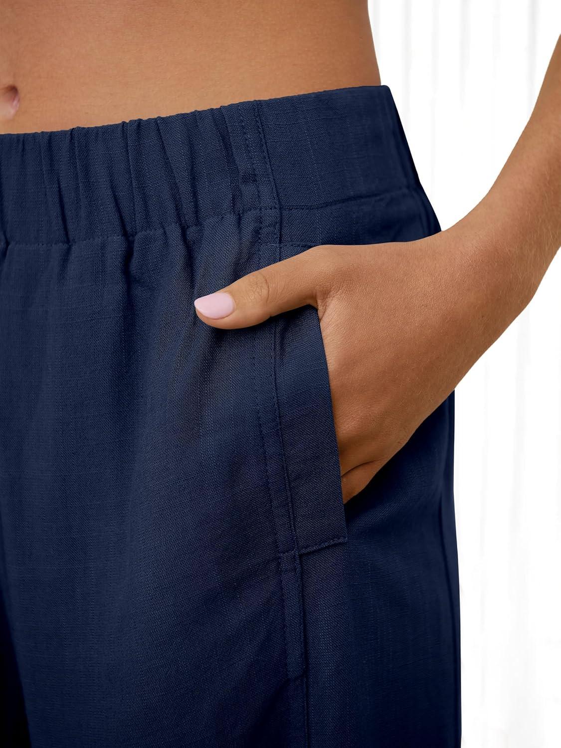 imageANRABESS Womens Wide Leg Linen Pants Summer Boho Casual Elastic Waist Long Lounge Travel Pants Trousers with PocketsNavy Blue