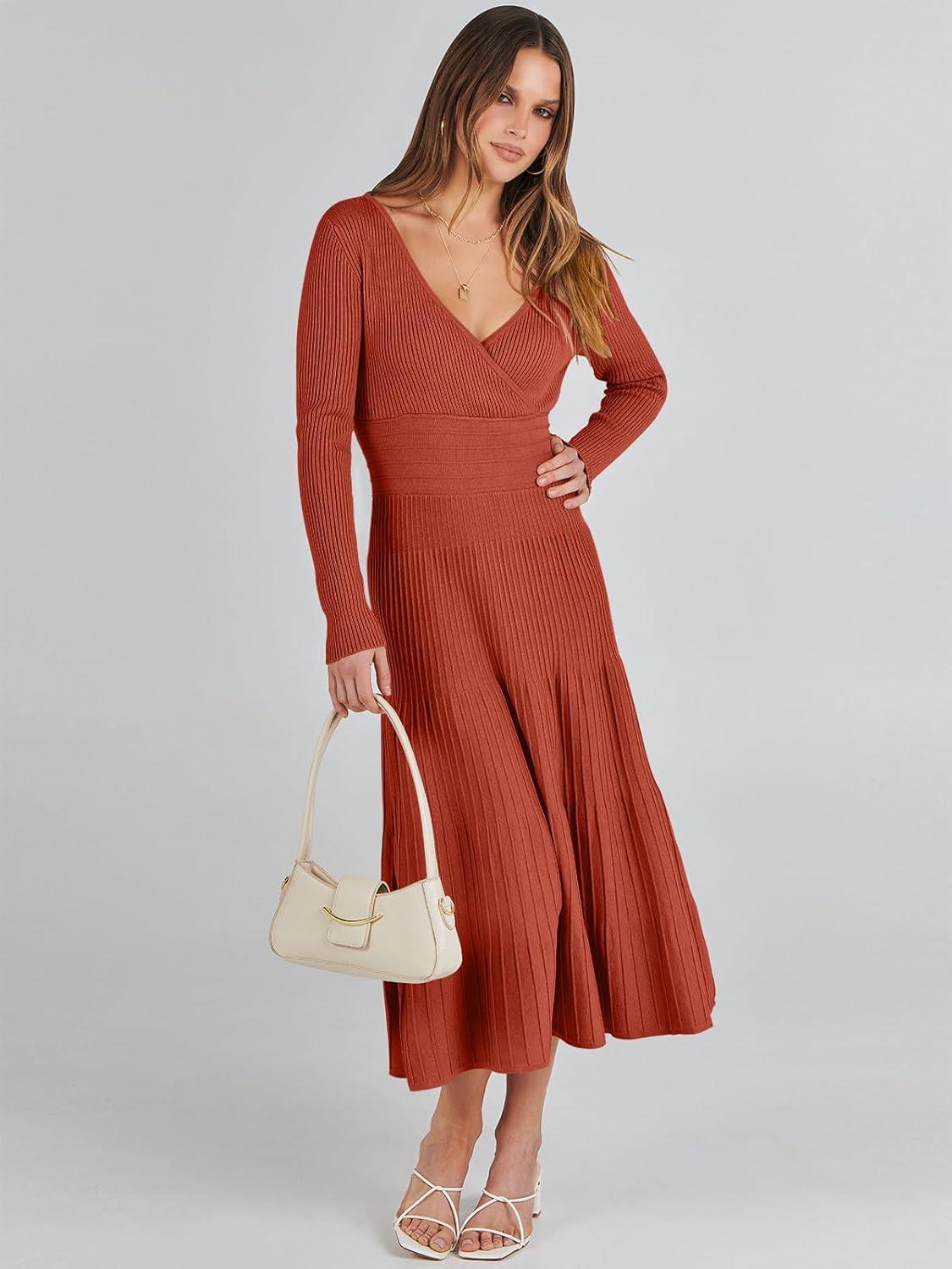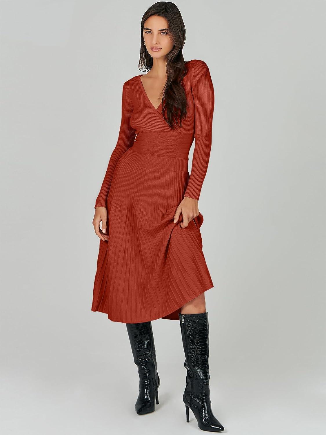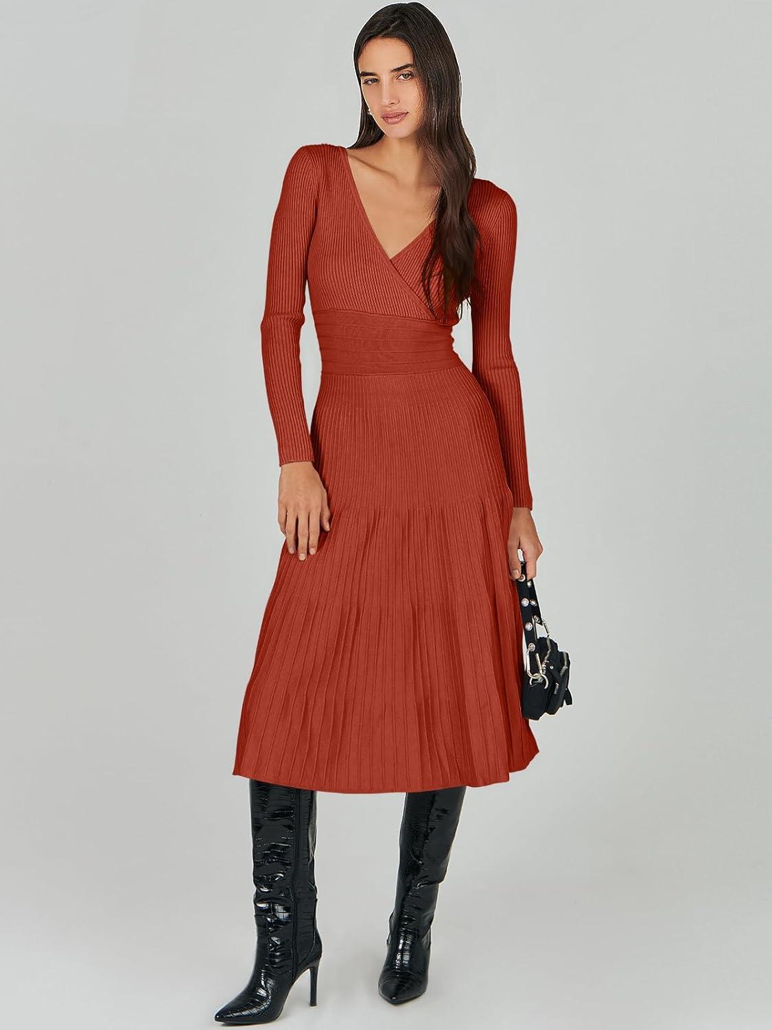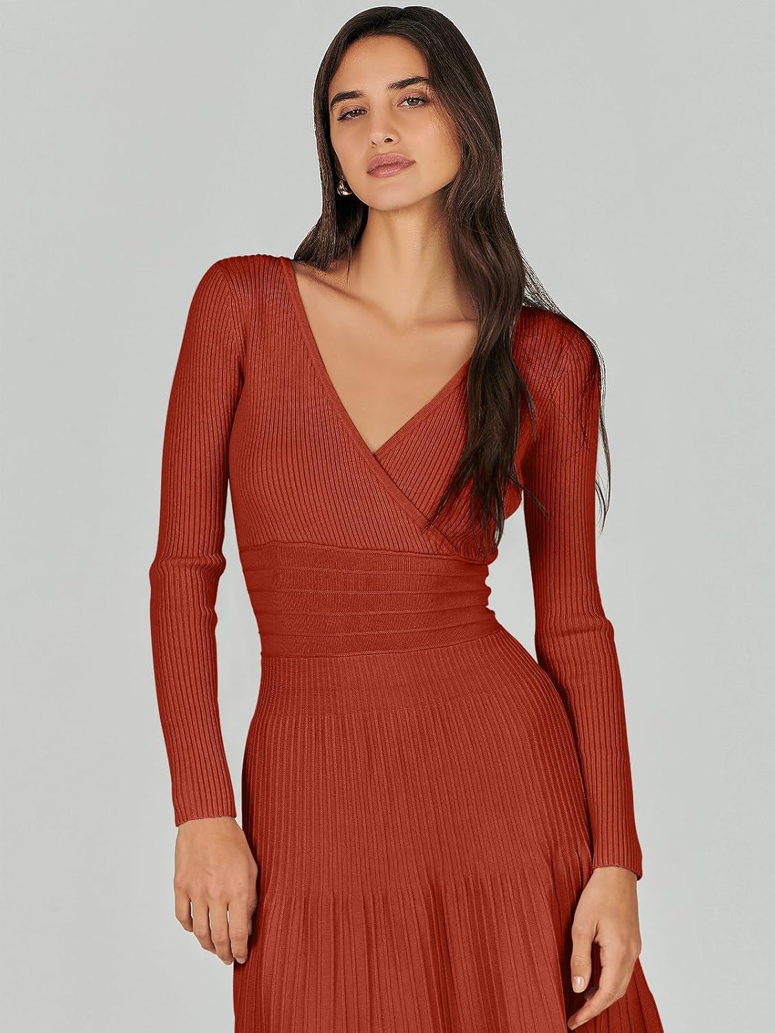 ANRABESS Womens Wrap Midi Sweater Dresses Long Sleeve V Neck Ribbed Knit Bodycon High Waist Pleated A-Line Dress 2025 Trendy(Rust Red)