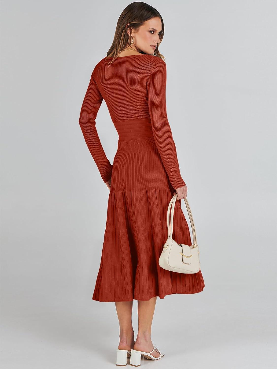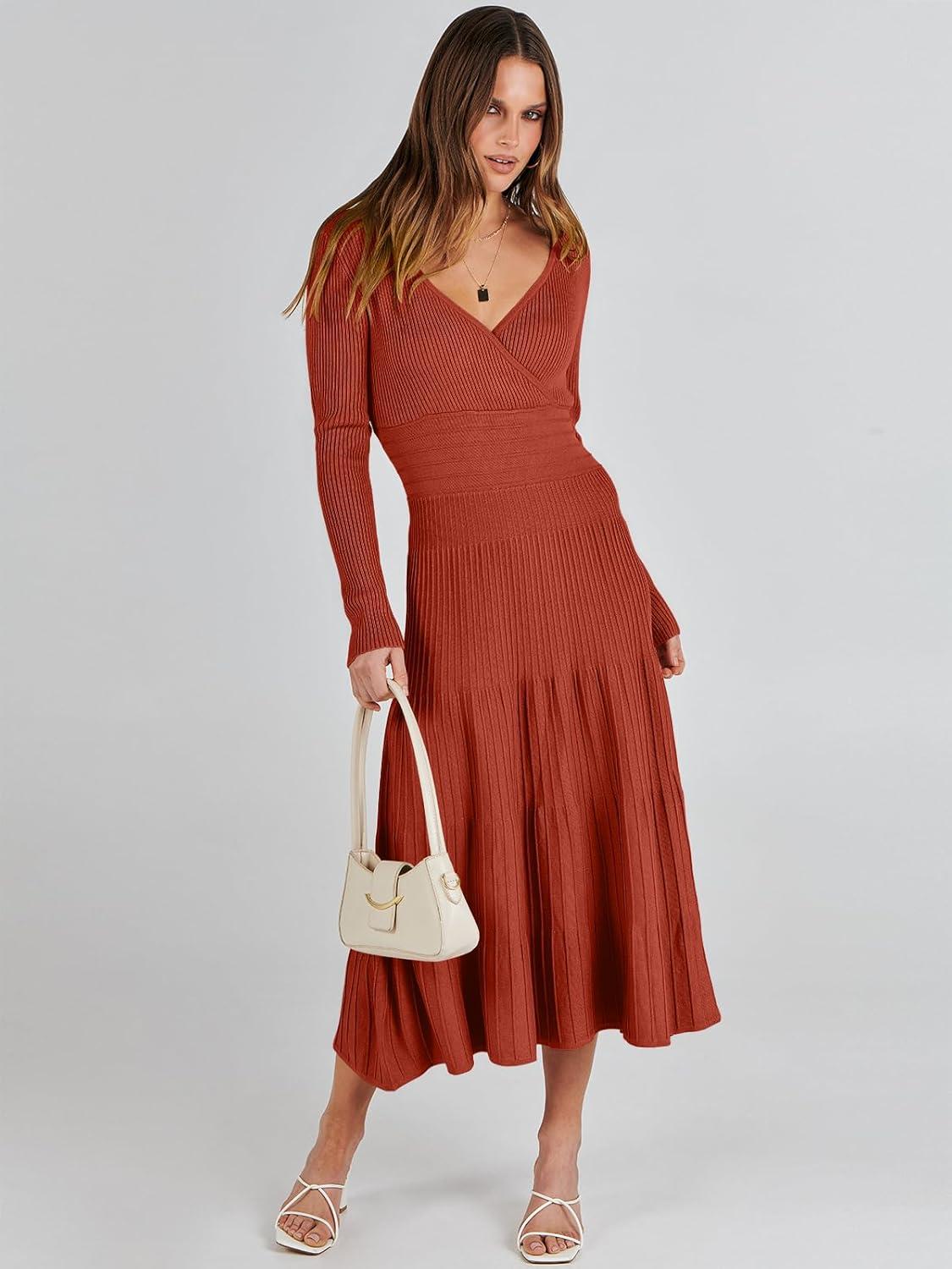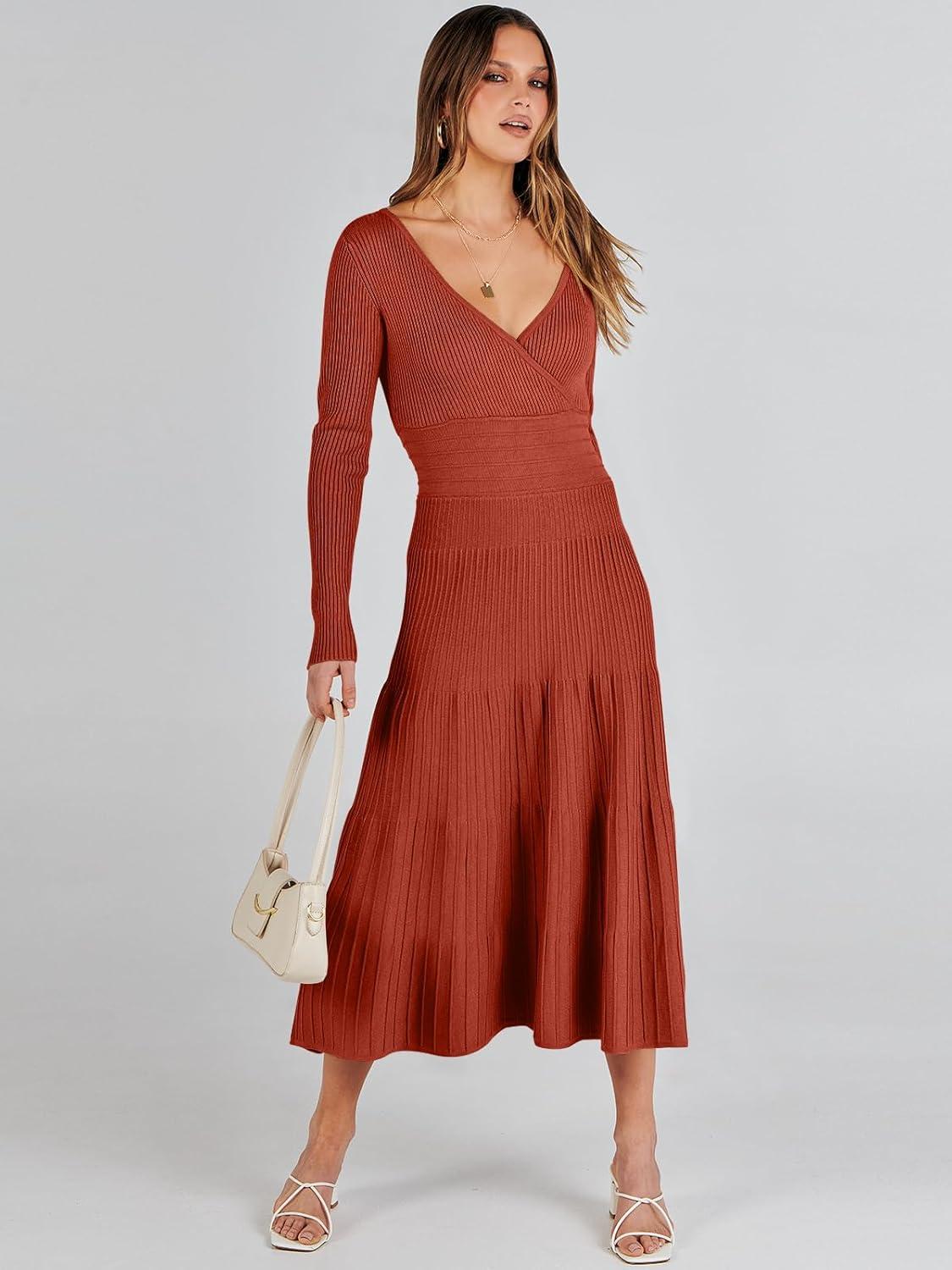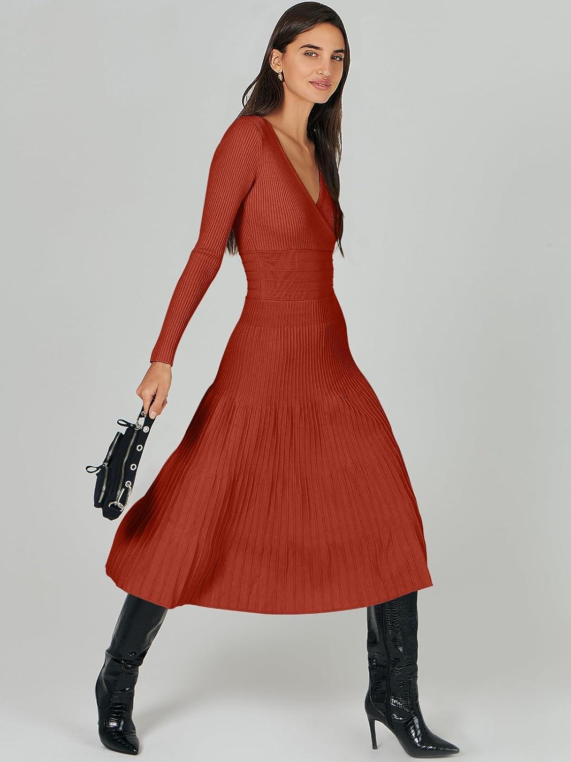 ANRABESS Womens Wrap Midi Sweater Dresses Long Sleeve V Neck Ribbed Knit Bodycon High Waist Pleated A-Line Dress 2025 Trendy(Rust Red)