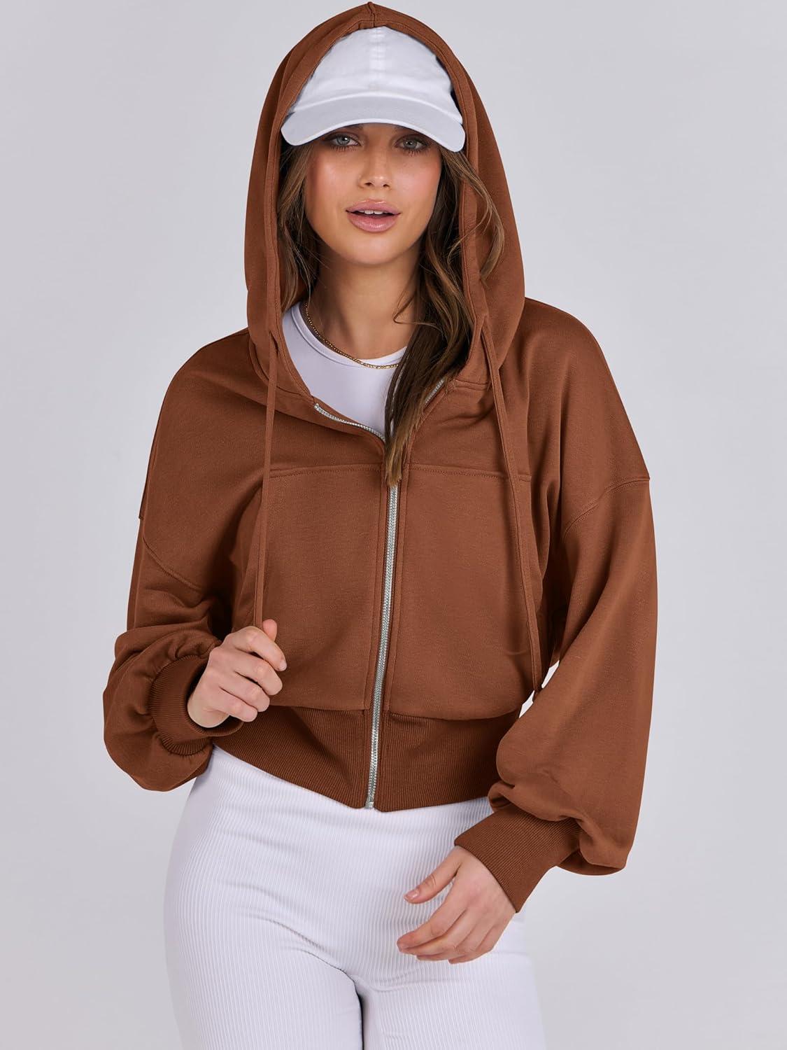 ANRABESS Womens Zip Up Hoodies Cropped Sweatshirts Casual Comfy Cute Zip Jackets Fashion Trendy Fall Outfits 2025 Y2K Clothes(Caramel)