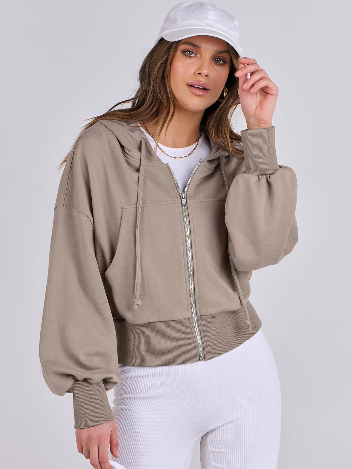 ANRABESS Womens Zip Up Hoodies Cropped Sweatshirts Casual Comfy Cute Zip Jackets Fashion Trendy Fall Outfits 2026 Y2K Clothes(Khaki)