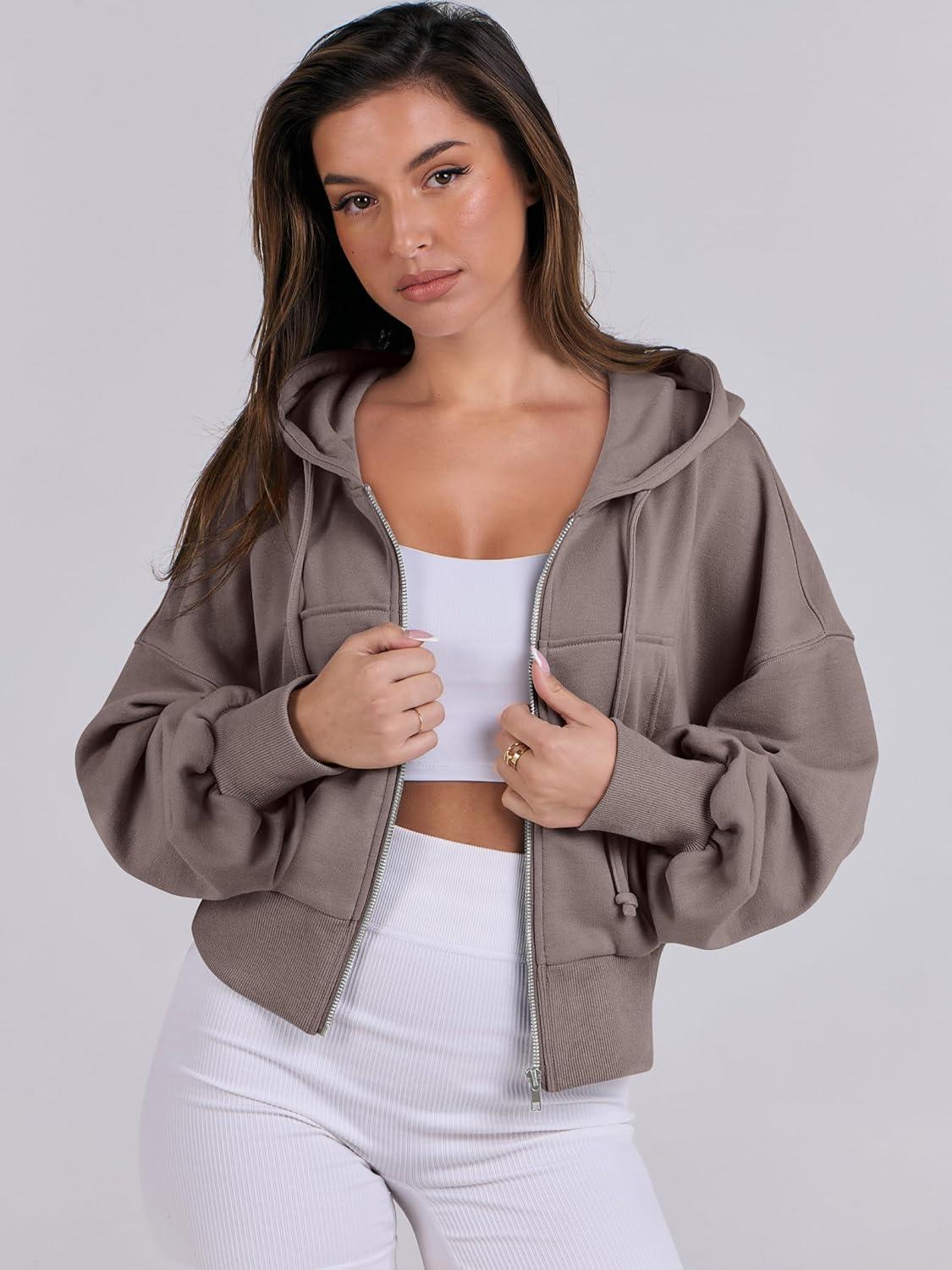 ANRABESS Womens Zip Up Hoodies Cropped Sweatshirts Casual Comfy Cute Zip Jackets Fashion Trendy Fall Outfits 2026 Y2K Clothes(Taupe)