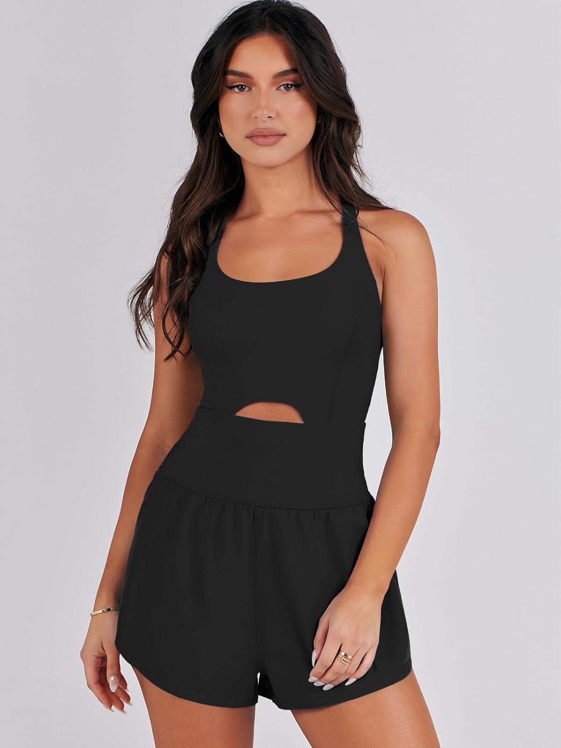 Caracilia Women’s Workout Athletic Romper Summer Sets Short Jumpsuits Onesie Running Outfits Exercise Gym 2025 Trendy Clothes(Black)