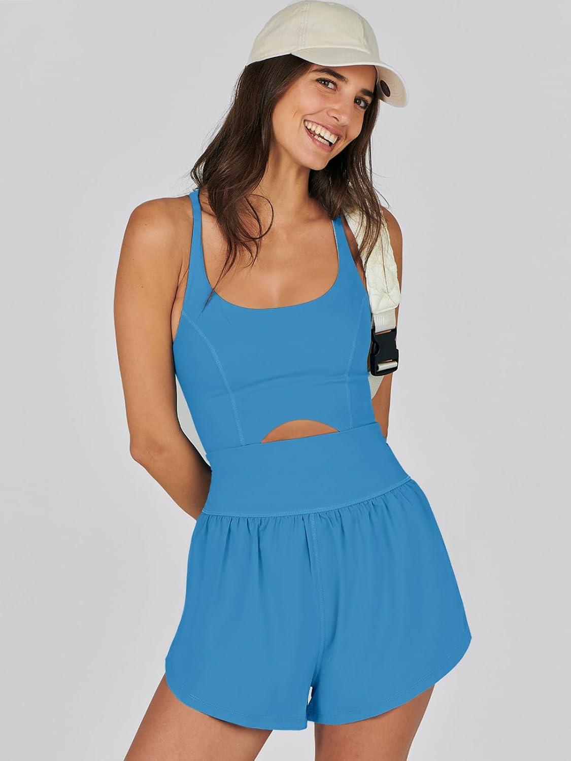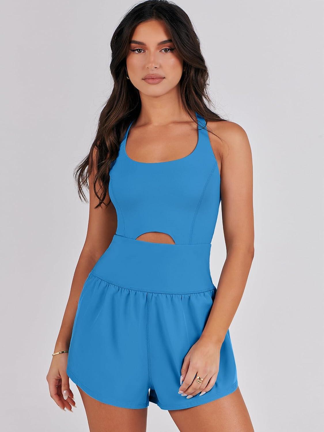 Caracilia Women's Workout Athletic Romper Summer Sets Short Jumpsuits Onesie Running Outfits Exercise Gym 2025 Trendy Clothes(Blue)