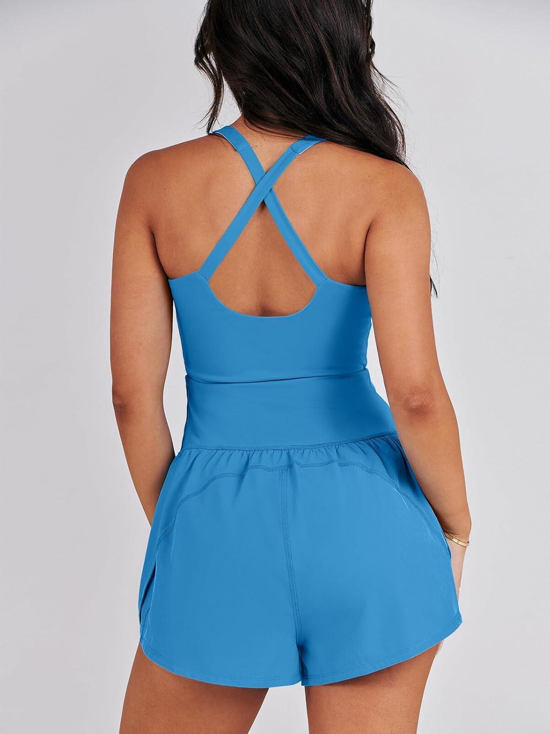 Caracilia Women’s Workout Athletic Romper Summer Sets Short Jumpsuits Onesie Running Outfits Exercise Gym 2025 Trendy Clothes(Blue)