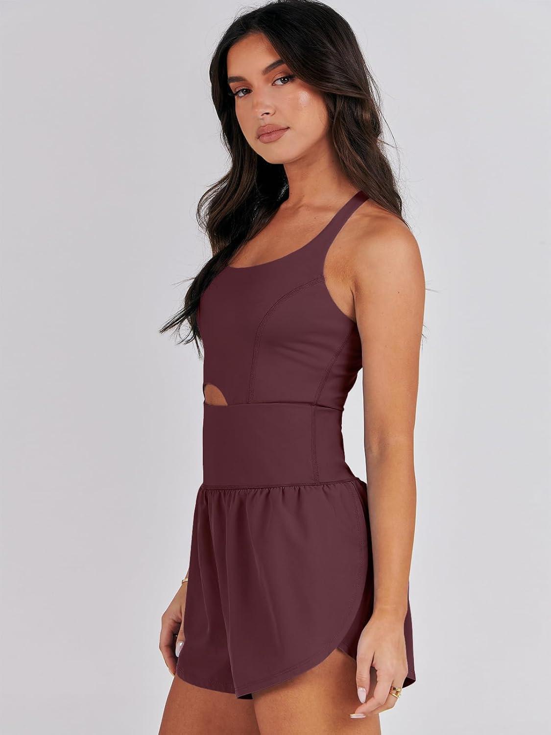 Caracilia Women's Workout Athletic Romper Summer Sets Short Jumpsuits Onesie Running Outfits Exercise Gym 2025 Trendy Clothes(Deep Red Brown)